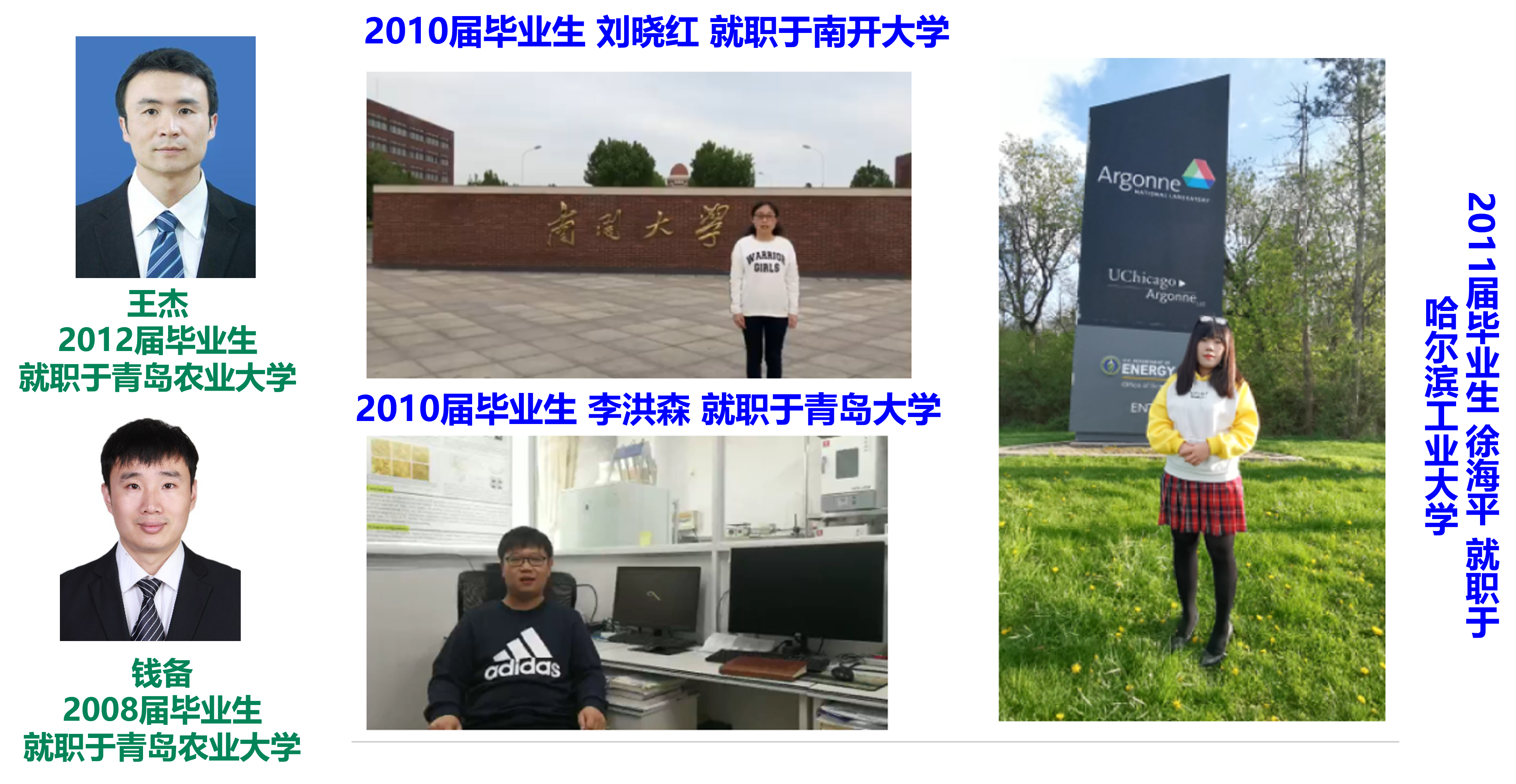 优秀员工:2010届毕业生刘晓红,曾获省级优秀毕业本科论文,现就职于南开大学。2010 届毕业生 ,曾获省优秀毕业本科论文,现就职于青岛大学。2011届毕业生徐海平,美国阿贡国家实验室博士后,目前就职于哈尔滨工业大学。