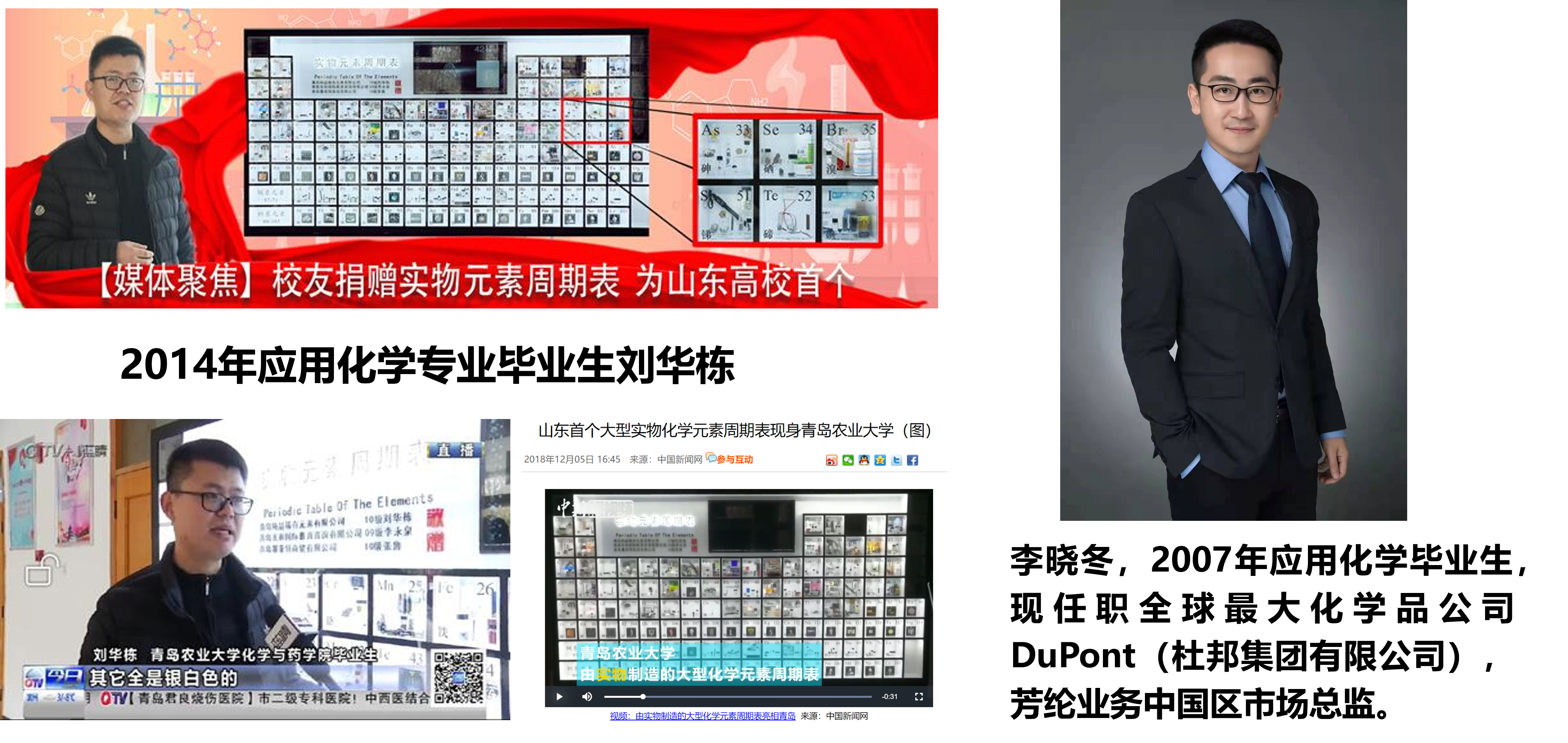 2014届应化专业毕业生刘华栋,毕业后凭借较强的专业功底开始了自主创业,目前已注册成立青岛纯晶稀有元素有限公司,从事于稀有元素的制备,客户包括科普馆、博物馆、大学实验室、研究所等。公司十周年院庆,他无偿捐赠实物元素周期表为山东省首个大型实物化学元素周期表,曾获得媒体的广泛关注和报道。李晓冬,suncitygroup太阳集团应用化学专业2007届毕业生,现任职于全球最大化学品公司DuPont(杜邦集团有限公司),芳纶业务中国区市场总监。