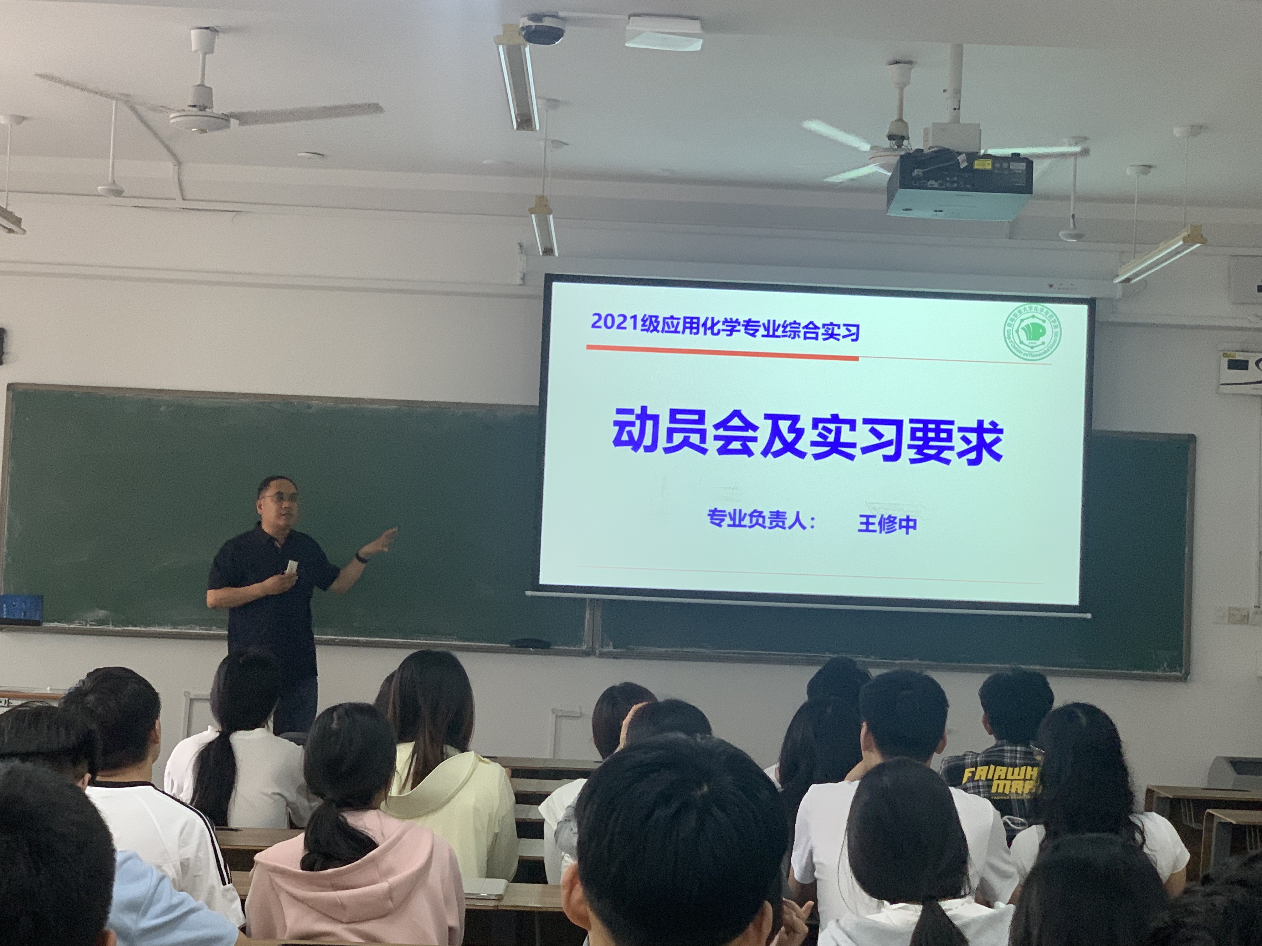 本届综合生产实习以化工和药物生产安全教育、模拟体验、现场观摩、讲解形式展开。实习第一天,由专业负责人王修中教授在校内对2021级全体员工进行实习前的动员,对实习期间的乘车和伙食安排等具体内容进行安排,重点强调了企业实习期间安全注意事项和实习结束后的实习的总结和实习报告的提交等。