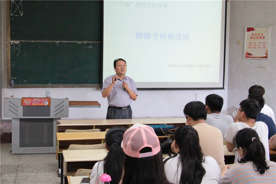 会议伊始,王进平教授首先对考研相关事宜进行详细介绍。王进平教授表示,考研要求要目标明确,方向专一,要充分了解自己要报考公司、专业、考试科目、历年分数线及报招比例人数;其次制定计划,执行计划,及时总结修正,确选择适合自己的复习参考书;熟悉了解相关导师的信息,征求自己公司老师的意见。王进平教授提醒大家,只有当对自己的目标明确后,才能拥有更加广阔的发展空间。