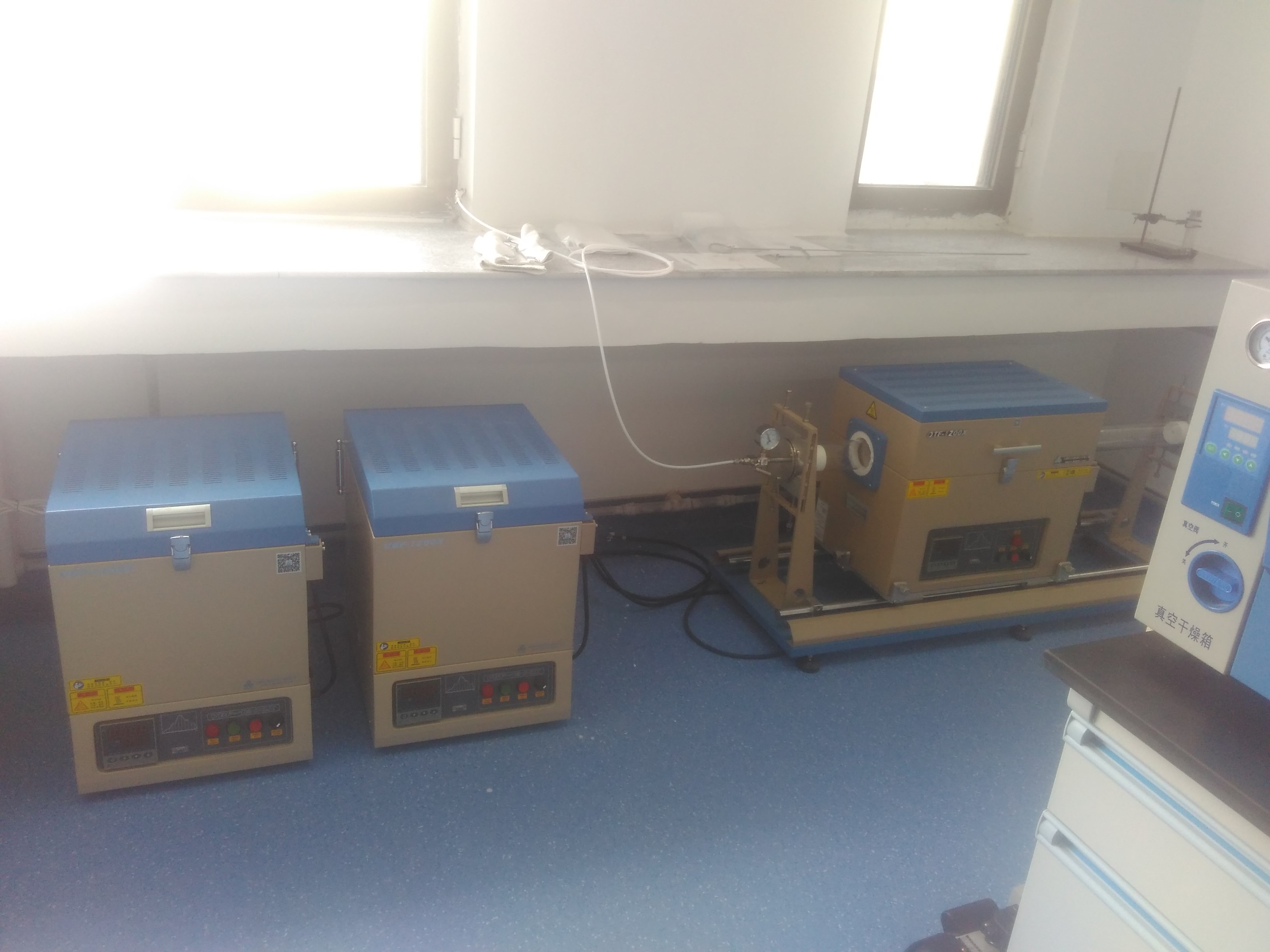 - 其他仪器:立式箱式炉、台式高速离心机、旋转蒸发仪、低温冷却循环泵、鼓风干燥烘箱、 程序控温鼓风烘箱、真空烘箱、超声波清洗仪、小型电动扣式电池封装机、液压扣式电池封装/拆卸机、微型震动球磨机、扣式电池切片机、手动粉末压片机、水焊机、万分之一天平、千分之一天平、百分之一天平、加热控温搅拌器(大龙、长城)、真空油泵、小型隔膜真空泵、小型紫外分析仪(有机合成点板)、Thinkpad工作站、联想电脑、冰箱、切纸机等
