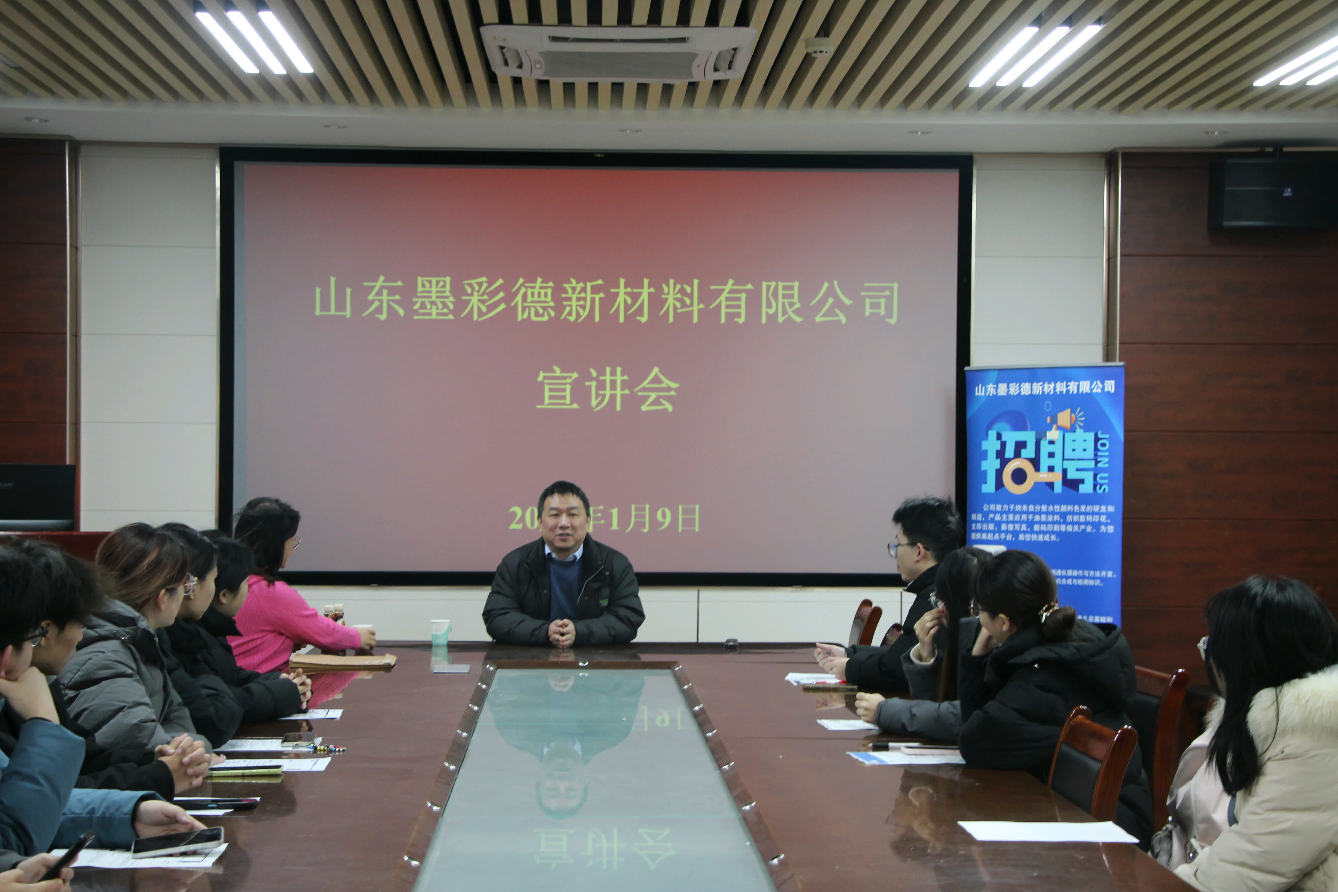 为深化校企合作、拓展就业渠道,促进公司高质量人才培养与产业需求精准对接,1月9日,suncitygroup太阳集团于化学楼207议室举办山东墨彩德新材料有限公司招聘宣讲会,本次宣讲会由企业副总经理王锐主讲,公司2026届毕业生代表参会。