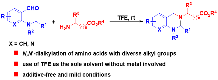 23. Hongjin Shi, Lubin Xu, Didi Ren, Liang Wang,* Weisi Guo and Shuai-Shuai Li*, Fluorinated alcohol mediated N,N’-dialkylation of amino acid derivatives via cascade [1,5]-hydride transfer/cyclization for concise synthesis of tetrahydroquinazoline, Org. Biomol. Chem. 2020, 18, 895-904. (IF = 3.876, 中科院三区)