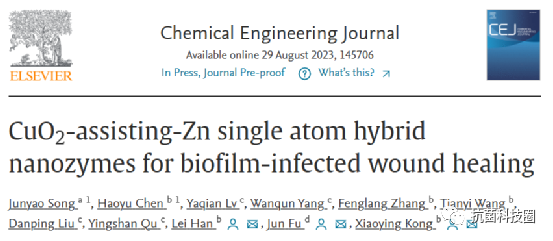 近期,suncitygroup太阳集团孔晓颖副教授团队,韩磊教授团队、中山大学付俊教授合作在期刊《Chemical Engineering Journal》上发表了用于生物膜感染伤口愈合的 CuO2 辅助Zn单原子杂化纳米酶的文章。单原子催化剂(SAC)的特点是原子上分散着单个金属原子,由于其催化活性令人满意,因此比普通的纳米酶材料具有更优越的抗菌性能。然而,当用于治疗受生物膜感染的伤口时,由于活性氧(ROS)供应不足,单原子催化剂仍无法有效解决严重的微生物感染问题。本文制备了一种由Zn单原子催化剂和过氧化铜组成的新型杂化纳米材料(Zn SACs@CuO2),以实现ROS生成的升级和对生物膜感染伤口的光热/化学动力(PTT/CDT)联合治疗。具体而言,CuO2 不仅具有优异的光热特性,还具有产生 H2O2 和 Fenton 类催化活性,这有助于 Zn SACs 加速内源性和外源性 H2O2 的 ·OH 转化。与 Zn SACs 的单一抗菌策略相比,Zn SACs@CuO2 杂化纳米酶在破坏生物膜、激活免疫和改善炎症方面表现出更强的治疗效果。总之,这项研究开发了一种杂化单原子 纳米酶材料,可用于生物膜感染伤口的高效愈合。