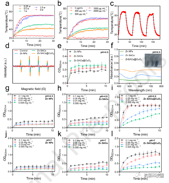 要点二:抗菌机理:碳(C)和铜(Cu)作为 PTT 剂,具有很高的光热 转化效率高的 PTT 药剂,从而实现高效的 PTT 抗菌疗法。同时,在酸性伤口微环境下,CuO2 被可逆地分解为 Cu2+ 和 H2O2,随后金属活性位点(Zn SACs 和 Cu2+)与 H2O2 发生高效的过氧化物反应,生成高毒性 ·OH 用于 CDT 抗菌治疗。更重要的是,Zn SACs@CuO2 杂化纳米酶能很好地愈合生物膜感染的伤口,从根除细菌感染、缓解炎症和激活免疫系统中获益。