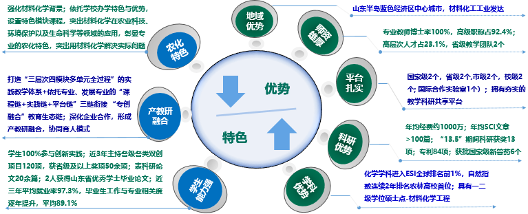 专业培养特色:在公司办学思想的指引下和长期的办学实践中,结合公司的农科特色和优势,立足于农化行业,强化以化肥农药控释材料、可降解农膜新材料、新型农药和农药残留检测传感材料等实践需求为导向,理论与实践深入融合,突出材料化学在农业、食品、环保等领域的应用,彰显农化新材料特色。