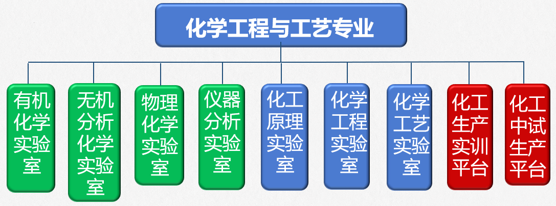化学工程与工艺专业设置了四大基础化学实验室、三大专业实验室和两大实训和中试实验室。实验室面积3000余平方米,拥有大型仪器设备40余台,仪器设备总资产价值2500余万元,具有校外教学实习基地11个。