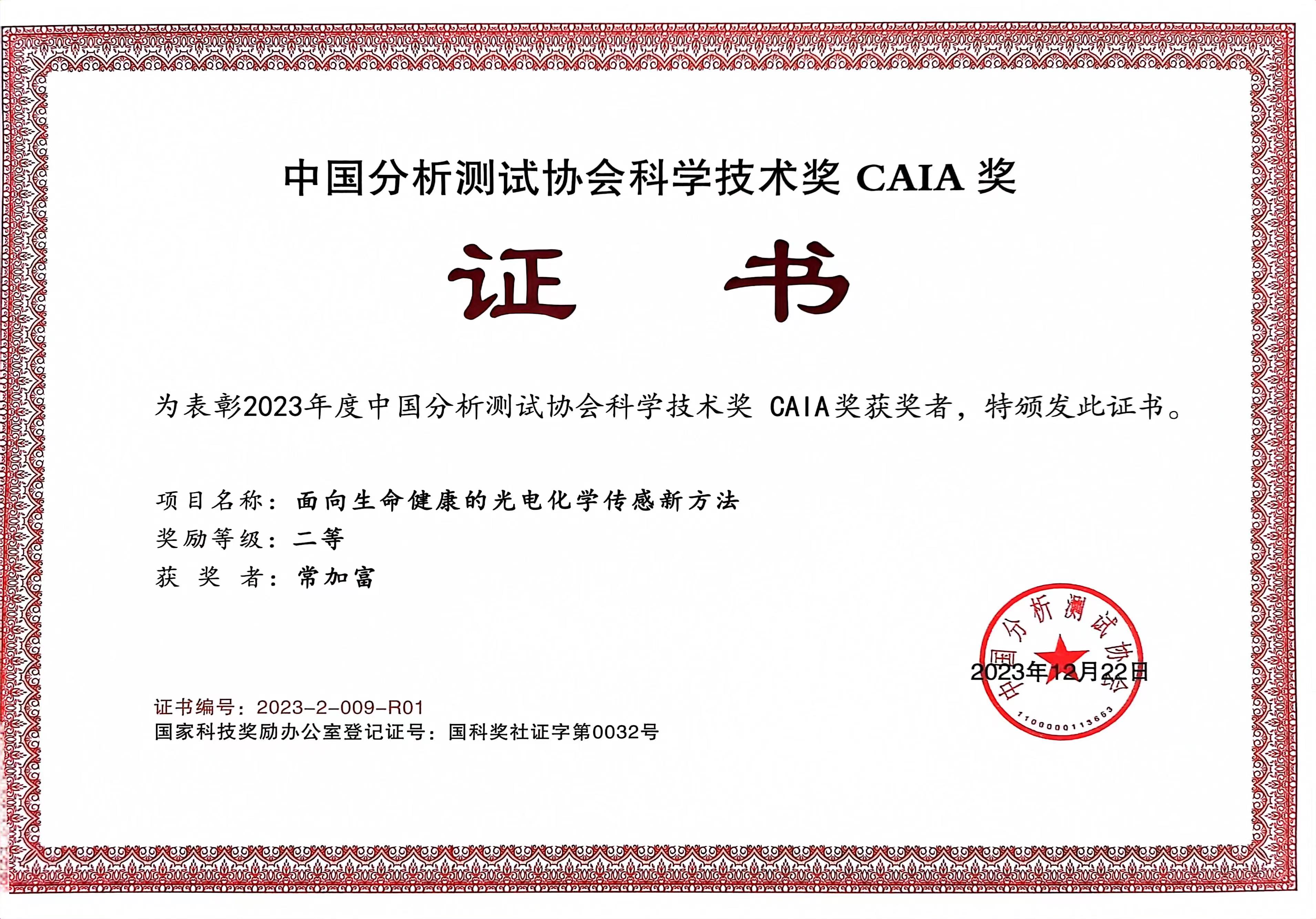 祝贺《面向生命健康的光电化学传感新方法》项目荣获2023年度中国分析测试协会科学技术奖CAIA奖二等奖,项目主要完成人为常加富、李海银、杨立敏、刘晓娟、李峰