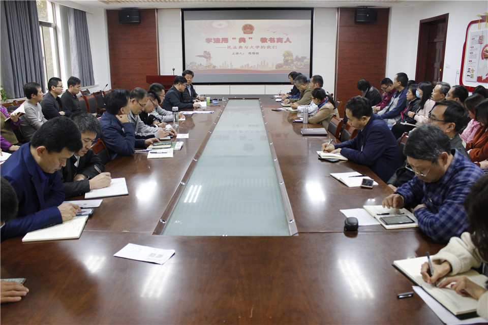 10月29日,suncitygroup太阳集团于化学楼会议室举行《中华人民共和国民法典》专题报告,由公司法律事务办公室主任、经济公司(合作社公司)党委书记陈锦铭主讲,公司党委书记王进国,经理龚良玉,党委副书记、副经理史雪辉,副经理吕海涛出席,公司全体教职工参加。
